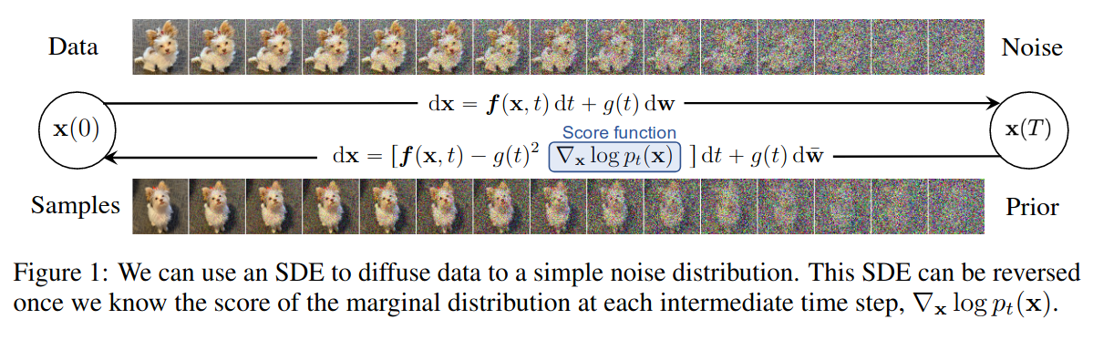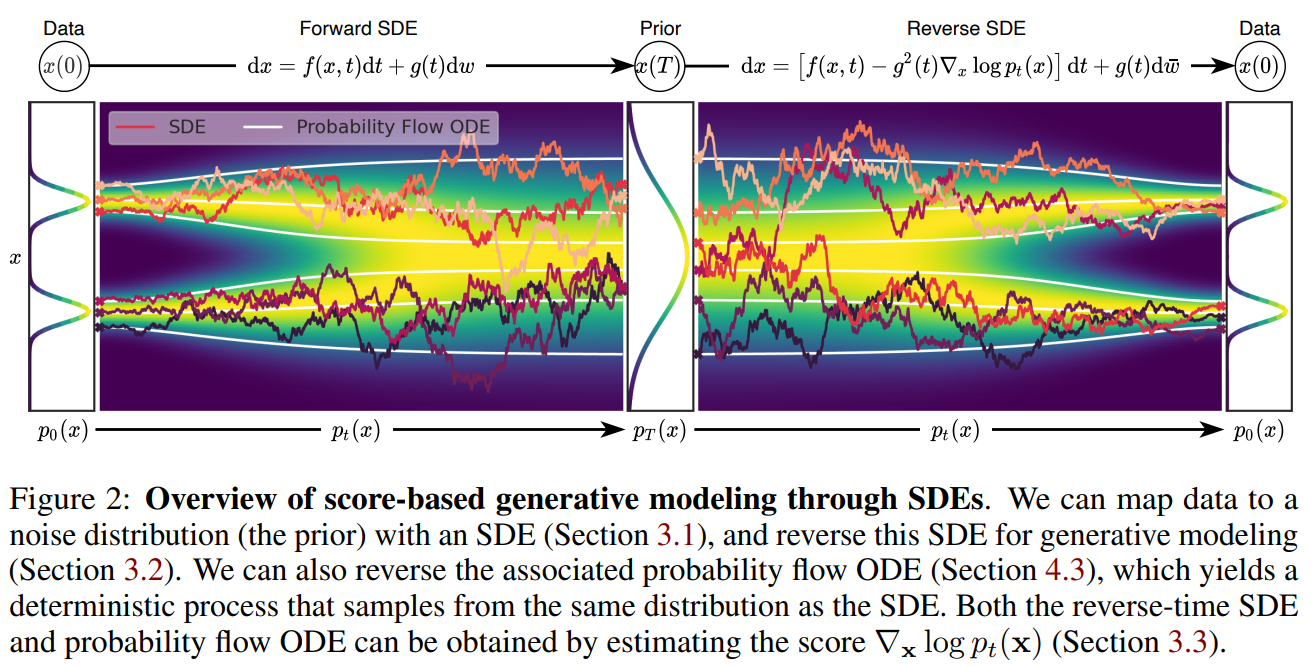网络学习的就是下半部分的反向过程:从噪声一步步去噪回原图(反向扩散)。因此,扩散模型本质上是在学习一个“随机微分方程 (SDE)”的逆过程